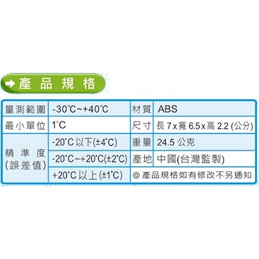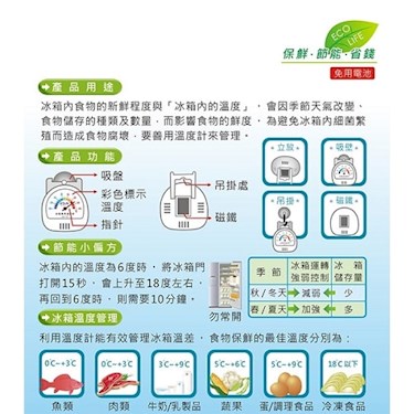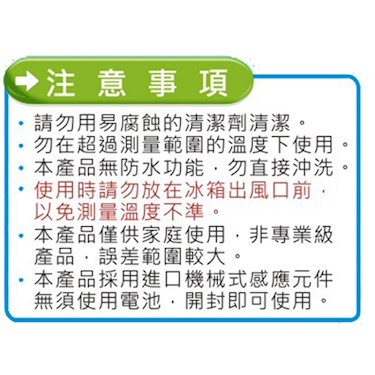 首頁 調理、度量用具 量杯、度量用具、計時器 冰箱專用溫度計 GM-70S (c10) 會員價NT$75 加入收藏 貨號:471091889381 單位:個 標識:溫度計 規格/顏色 約7x6.5x2.2cm 數量 加入購物車 立即結帳 滿額免運全館滿$2000元免運優惠!(限台灣本島非偏遠地區) 滿額可用優惠券單次消費$1000 元以上(不包含運費),可使用$50元優惠券。 主要特色 商品特點 注意事項 相關商品 主要特色 隨時監控冰箱溫度,節能環保省電省錢。免用電池。冷凍/冷藏皆適用。耐溫範圍-30~+40℃ 商品特點 ◆隨時監控冰箱溫度,選擇最佳保鮮效度,調節冰箱運轉強弱,節能環保省電省錢。◆免用電池。◆冷凍/冷藏皆適用。◆吊掛、立放、吸壁磁鐵。◆彩色溫度顯示,掌握保鮮指南。◆耐溫範圍-30~+40℃。最小單位1℃。材質:ABS塑膠。中國大陸製。 注意事項 相關商品 長型溫度計 150 度 (刻度0~150℃) ※ 長型溫度計 100度(刻度0~100℃)(c10) 溫度計(筆型)200℃ Dretec 防水測油溫度計(白色) ※ 冰箱專用溫度計 GM-70S (c10) 旋轉大螢幕精準電子式溫度計 加長型旋轉大螢幕精準電子式溫度計 GE-39R 台製-紅外線測溫槍(非接觸式溫度計) 加長型油炸溫度計 300 度(不鏽鋼) GE-725D 寶馬牌速顯式電子式溫度計 -45~+200℃ 金太郎紅外線測溫槍(非接觸式溫度計)-中國製 日式烤箱溫度計 GM-280 ※
