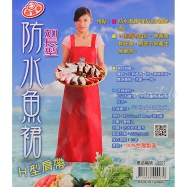 台灣製造。防水處理,可防止液體滲透。井字肩帶,好固定,圍裙不易鬆落。適用於餐飲、生鮮處理、農漁養殖、洗車..等。長度約到成年女子的小腿。