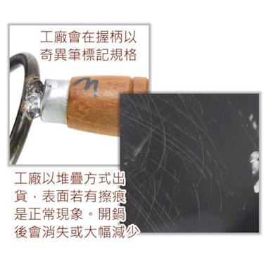 ◆(A)原廠出貨皆無包裝,因以堆疊方式出貨,表面若有刮痕是正常現象。開鍋後便會消失或大幅減少。(B)工廠會在握柄以奇異筆標記規格。這兩種情況均不影響使用。