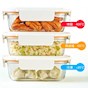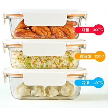 耐熱玻璃上蓋可視,盒身可進烤箱、微波爐、電鍋(需用蒸架)、氣炸鍋。6mm凹槽圓滑設計,方便堆疊收納。可拆式扣環、矽膠條,方便清潔。四面環扣設計,密封升級不外漏。