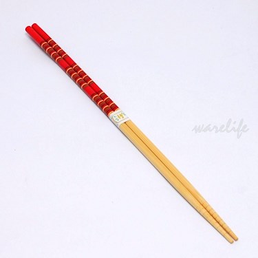 ◆本竹長筷前端為圓尖形,有止滑刻紋,把手為上漆其中圈圈處略微突起、具有簡單的止滑效果。