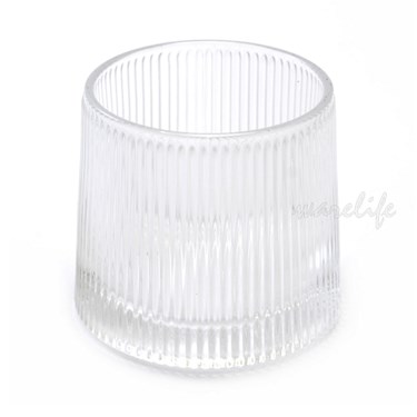 玻璃材質。外側為直條紋路,較不易滑手,內部為光滑。可當威士忌杯、水杯杯。