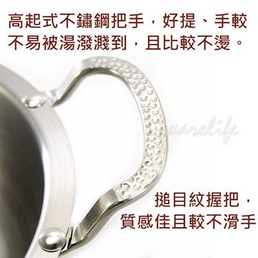 ◆高起式不鏽鋼把手,不易斷裂、好提好拿、手較不易被湯潑濺到,且比較不燙。搥目紋握把,質感佳且較不滑手。
