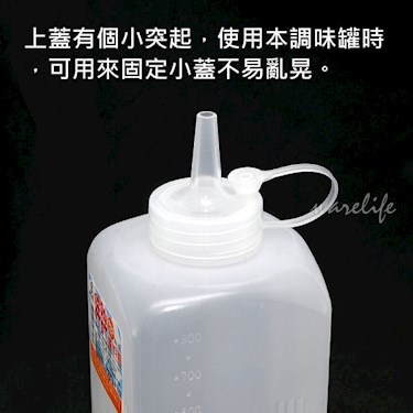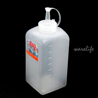 台灣製。材質:本體PE上蓋PP。上蓋附小蓋,可有效阻隔灰塵。上蓋有個小突起,可用來固定小蓋。瓶身有立體刻度(50cc一格)。