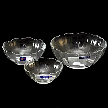 強化玻璃沙拉碗。比一般玻璃強度高約4-5倍。耐用。可放熱食,但不宜微波或加熱。法國弓箭牌(Luminarc 樂美雅)中國廠製造。可當攪拌盆。