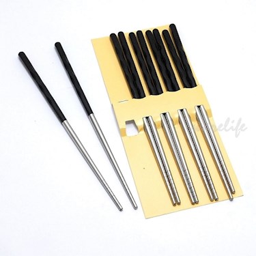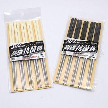 通過SGS檢驗。輕巧,質地堅硬,密度高,不易藏污納垢。握柄高分子玻璃纖維,耐熱220℃,不易燙手,前段304不銹鋼白鐵筷。少見的銅板價五雙入防燙柄304筷,CP值高。高雄名店汕頭泉成火鍋使用。