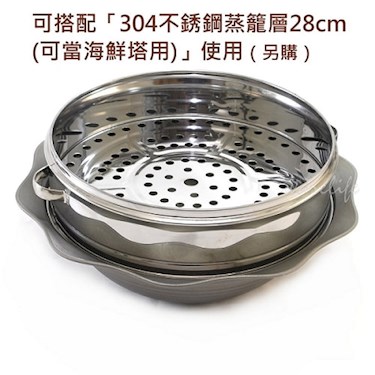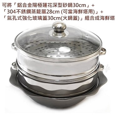 ◆可搭配「氣孔式強化玻璃蓋30cm(火鍋蓋)」使用(另購)也可加「304不銹鋼蒸籠層28cm (可當海鮮塔用)」而成海鮮塔。
