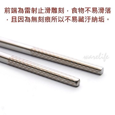 ◆筷子前端為雷射止滑雕刻,食物不易滑落,且因為無刻痕所以不易藏汙納垢。