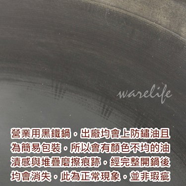 ◆使用時須起鍋與注意保養,不然會難炒又很快生鏽。若蒙購買,隨貨附贈「鐵鍋要如何起用&保養」說明圖表。