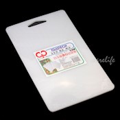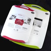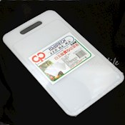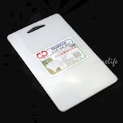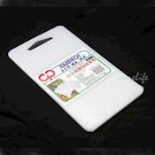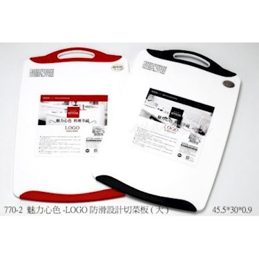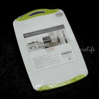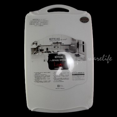 台灣製。耐熱 100℃。極少數可放熱食的塑膠砧板。止滑設計。抗菌處理並通過 SGS檢驗。可依手把不同顏色方便區分生食熟食。又稱為「菜砧、沾板、切菜板」
