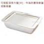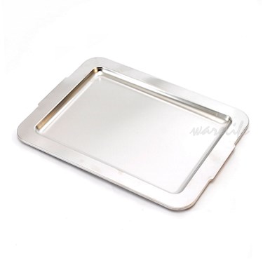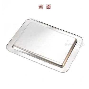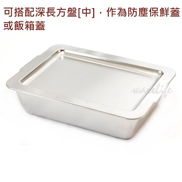 台灣製。蝴蝶牌。304不銹鋼。可搭配深長方盤(中),作為防塵保鮮蓋或飯箱蓋。捲邊處理。厚度約0.41mm。不鏽鋼長方盤又稱「不鏽鋼方盤、不鏽鋼深方盤、長方形鐵盤、不鏽鋼方盤、裝菜盤、超大鐵盤」