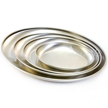 304不銹鋼腰子盤。耐用耐摔耐久好洗。可當菜盤、魚盤,有點深度,可當淺湯盤。捲邊處理,不易刮傷手。韓式料理用具、韓式料理餐具。