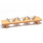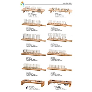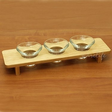 台灣製造。特殊造型,小酌展雅興,或是當小菜盤,都饒富風味。酒杯為厚底,玻璃材質。木架為三孔,天然原木。