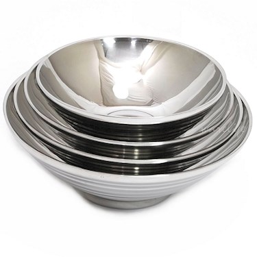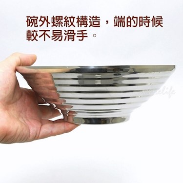 罕見的304不銹鋼隔熱生意碗。雙層隔熱,不易燙手。符合台北市政府的規範,可用來替代美耐皿或陶瓷拉麵碗。碗外螺紋構造,端的時候較不易滑手。