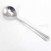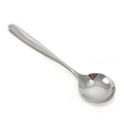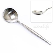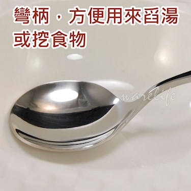 少見的彎柄大圓匙,方便用來舀湯或挖食物。實心,曲線阿娜多姿造型把柄、讓柄輕量化,兼具美觀與耐用。民生用304不銹鋼。拋光細膩,光滑表面,好清理。