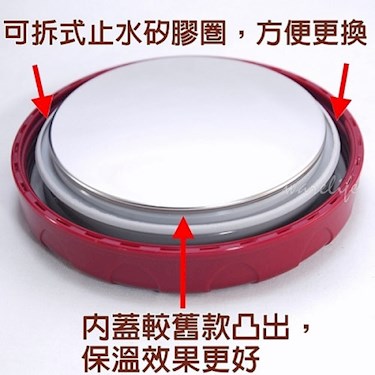 ◆與舊款主要有兩點不同:(1)上蓋的矽膠圈可拆下來更換。(2)新款的上蓋凸起,與鍋身的密合度更佳,保溫效果更好。
